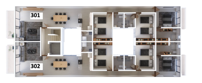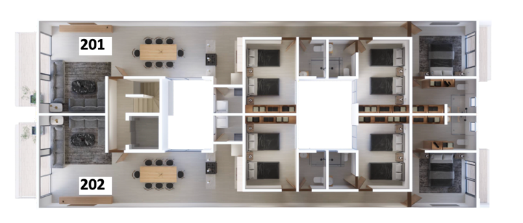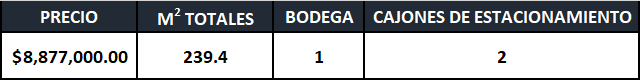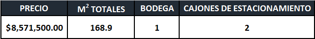Cuenta con ocho departamentos: dos con terraza y seis con balcón, de los cuales dos tienen Roof Garden privado. Además cuenta con un Roof Garden de uso común, estacionamientos de uso exclusivo, elevador y caseta de vigilancia.