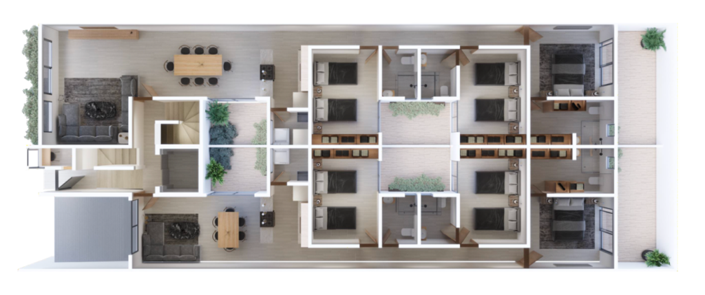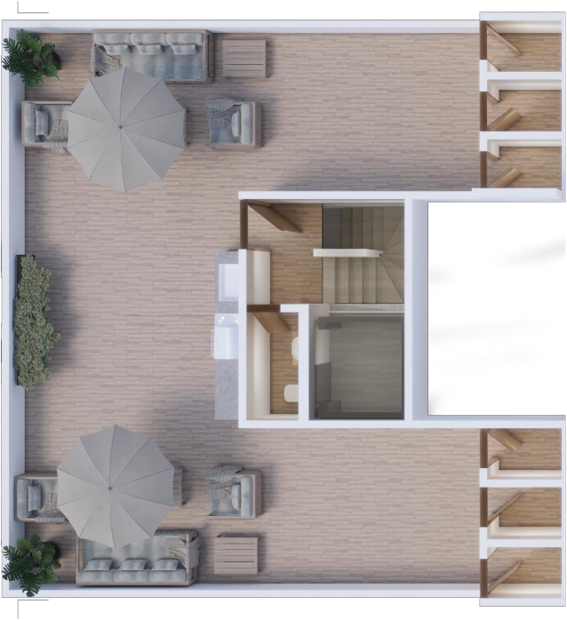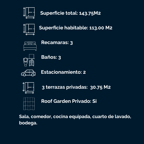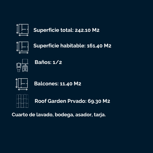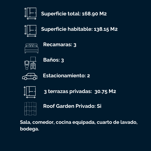 Cuenta con ocho departamentos: dos con terraza y seis con balcón, de los cuales dos tienen Roof Garden privado. Además cuenta con un Roof Garden de uso común, estacionamientos de uso exclusivo, elevador y caseta de vigilancia.